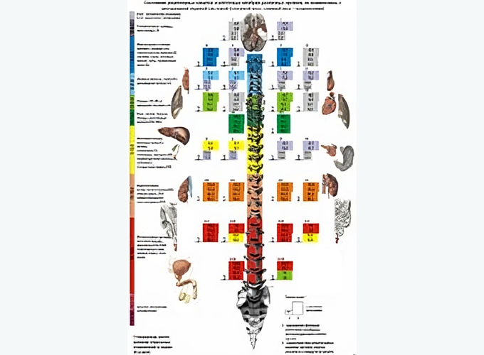 - Діаграма стану хребта та оцінки стану внутрішніх органів.Для діагностики стану хребта використовується режим часу «відсічення» при тривалих вимірах кожного відведення (не менше 2-3 сек). Асиметрія показників щодо хребетного стовпа і збільшення висоти стовпчиків сірого кольору свідчить про зсувах хребців і зменшення висоти міжхребцевих дисків.Програмне прогнозування розвитку патологічних процесів визначає зміни різних органів і систем у момент діагностики до перших ознак виникнення запалення в минулому до функціональної недостатності в сьогоденні або майбутньому. За результатами діагностики індивідуально для кожного пацієнта оцінюється процентна ефективність, рекомендованих лікувальних засобів.Мал. 4.